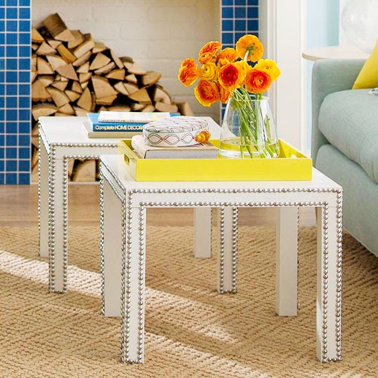 In place of a predictable coffee table, use two inexpensive side tables. Outline the edges with strips of nailhead trim for a high end look.